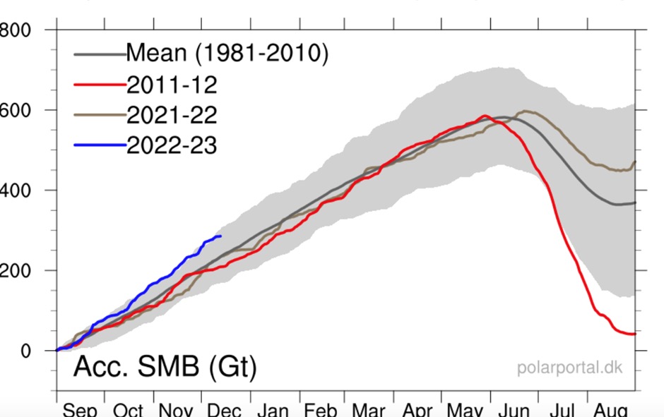 The surface mass of the Greenland ice sheet (above), measured by the Danish Meteorological Institute, has shown some stonking improvements over the last two months, with the 2022-23 blue line ahead of all the previous marks shown.