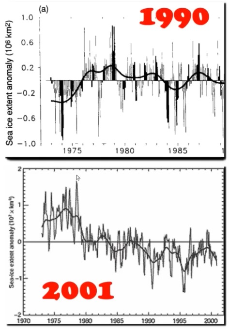 This ‘hidden’ data is clearly shown above in a graph from the first IPCC report in 1990. The lower levels of ice in the 1970s are plotted and the peak is in 1979.