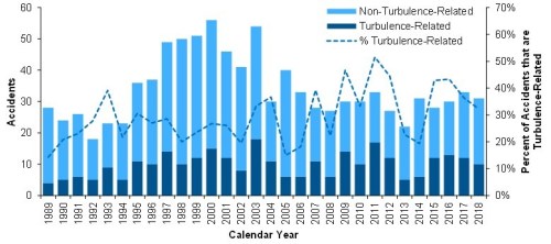 The scientists cited by the BBC completely ignored a 2021 report by the International Civil Aviation Organization (ICAO) that plotted accident data related to turbulence, finding no statistically significant increase since 1989, despite a tremendous increase in passengers and miles flown. See Figure 1 below: