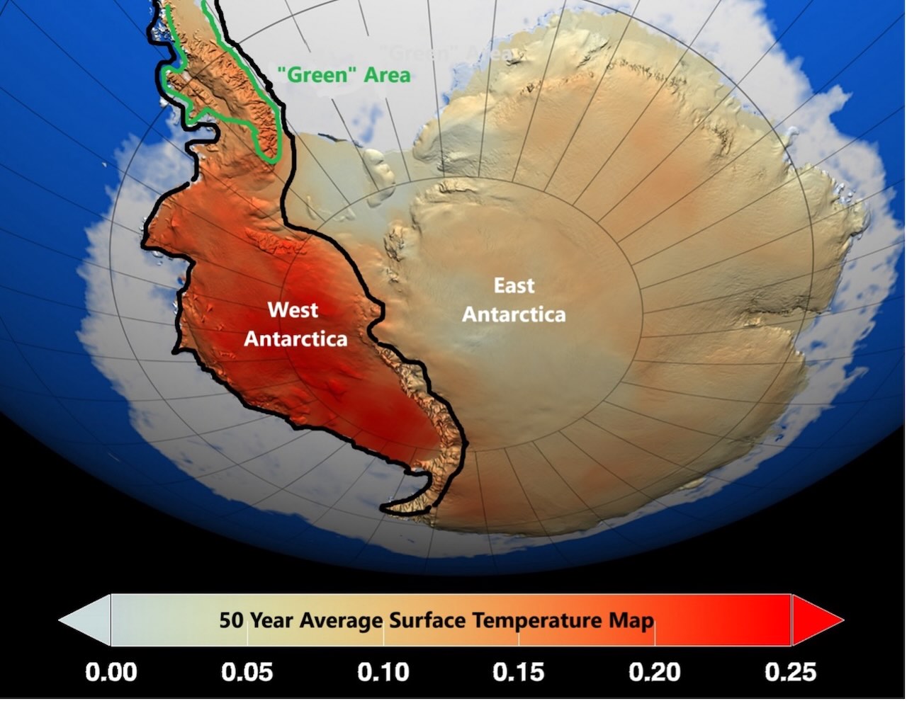 By including this data, it becomes clear that heat emitted from a molten lava accumulation beneath West Antarctica, rather than climate change, likely caused the “green” areas (Figure 1 below).