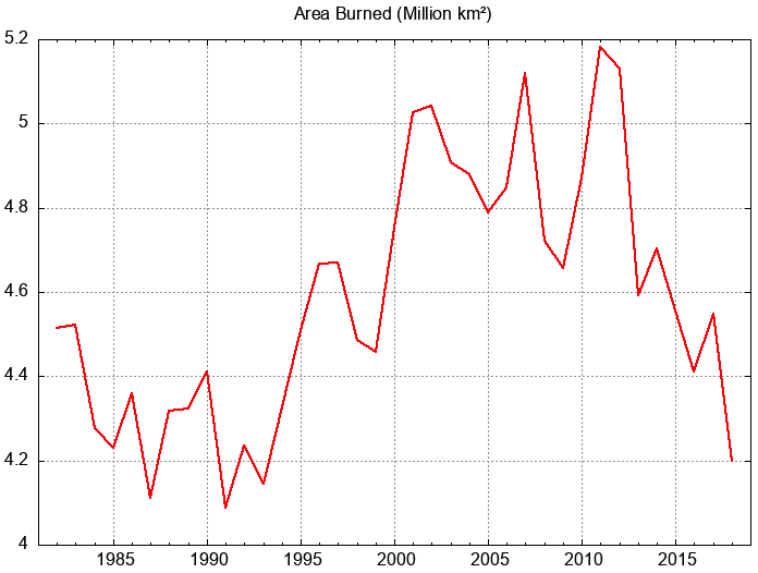 “Agricultural dust” aside, wildfires are not even becoming worse worldwide either, according to the European Space Agency’s wildfire area burned data. (See figure below)