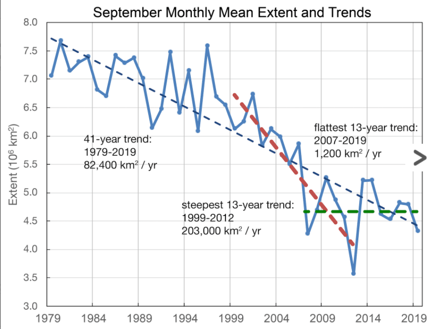 When looking back at the data since sea ice peaked in 1979, we realize that the overall trend for minimum September sea ice extent has flattened over the past 14 years: