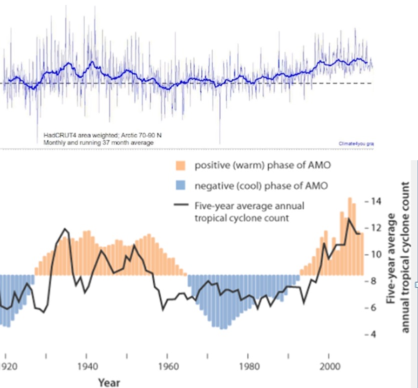 Next, we roughly superimpose a chart of the Atlantic Multidecadal Oscillation (AMO), one that also includes cyclone frequency: