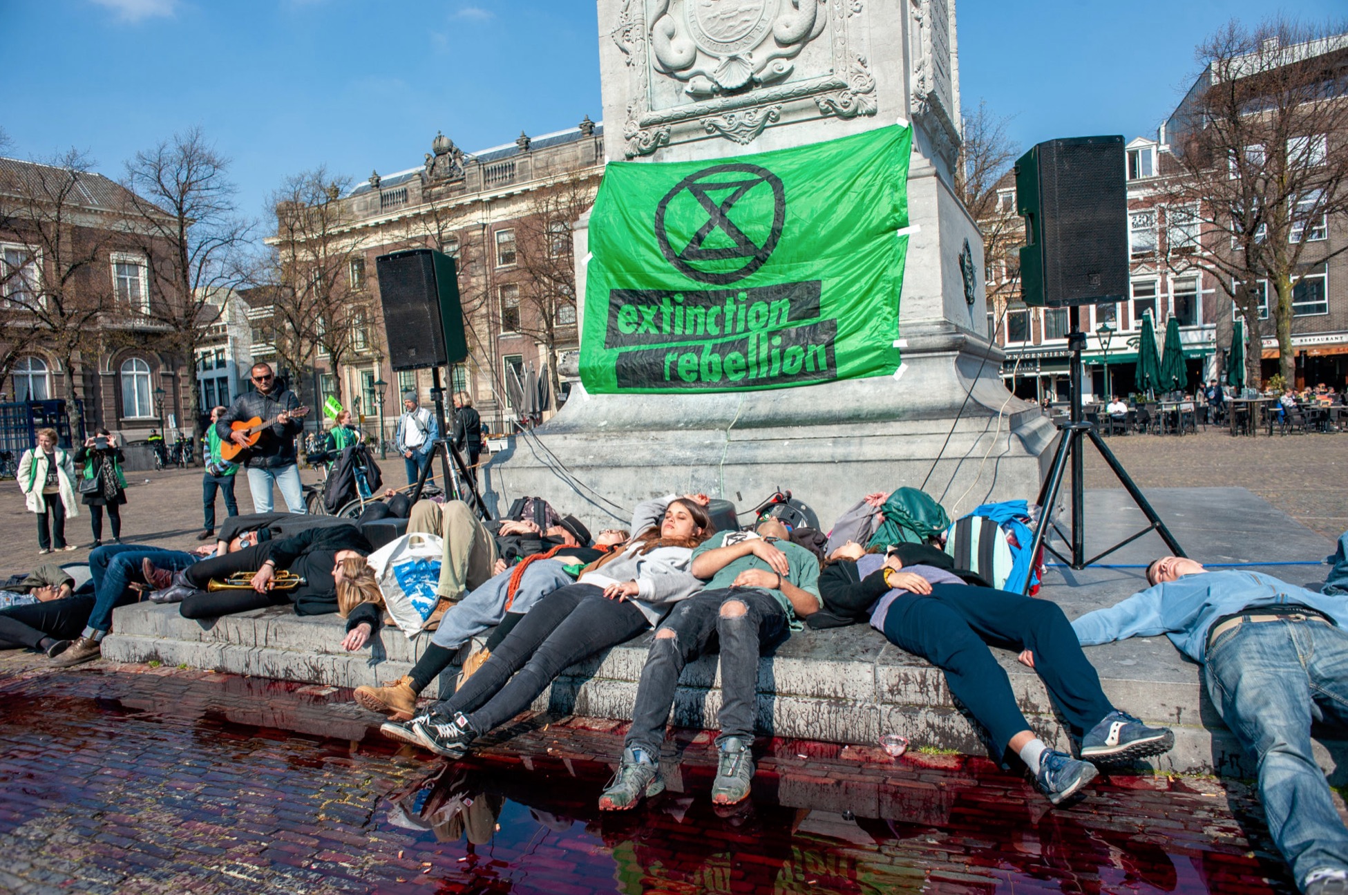 Fewer and fewer people die from climate-related natural disasters. (Pictured: Extinction Rebellion faking climate deaths.)