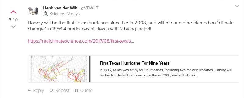 Henk van der Wilt @VDWILT on GAB posted, “Harvey will be the first Texas hurricane since Ike in 2008, and will, of course, be blamed on ‘climate change.’ In 1886 4 hurricanes hit Texas with 2 being major!!”