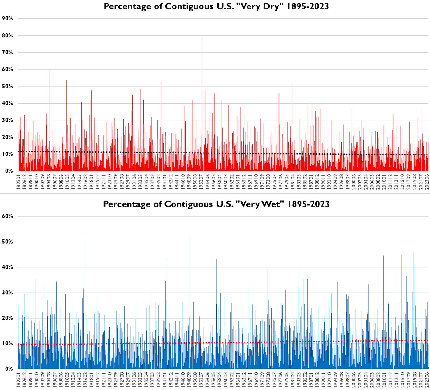 The figure below shows the proportion of US land area characterized as “very wet” and “very dry” from 1895 to 2023.