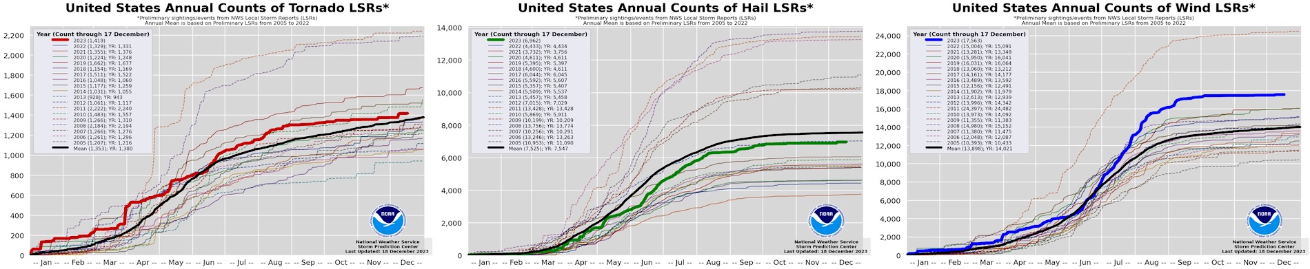 The figures above show from left to right, tornadoes, hail, and wind local storm report counts, based on preliminary data for 2023. The data shows that tornadoes are a bit above the recent average and hail is a bit below.