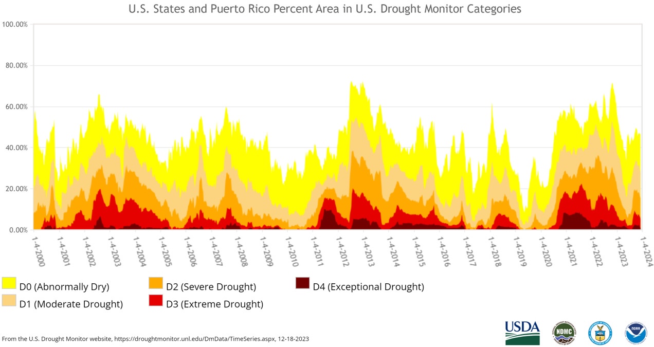 2023 ends the year just about in the 50th percentile of months since 2000 for areas under exceptional and extreme drought.