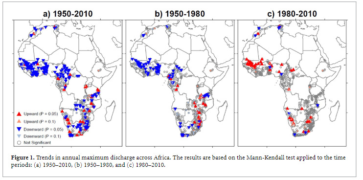 [T]here are statistically significant decreasing trends in annual maximum discharge at 214 out of 884 stations during 1950–2010, with increasing trends at only 60 stations. Overall, the largest changes are clustered in western and southern Africa. Based on these results, we would conclude that flooding in Africa has been decreasing since the 1950s, consistent with the results obtained by previous studies (Do et al 2017, Wasko and Sharma 2017).