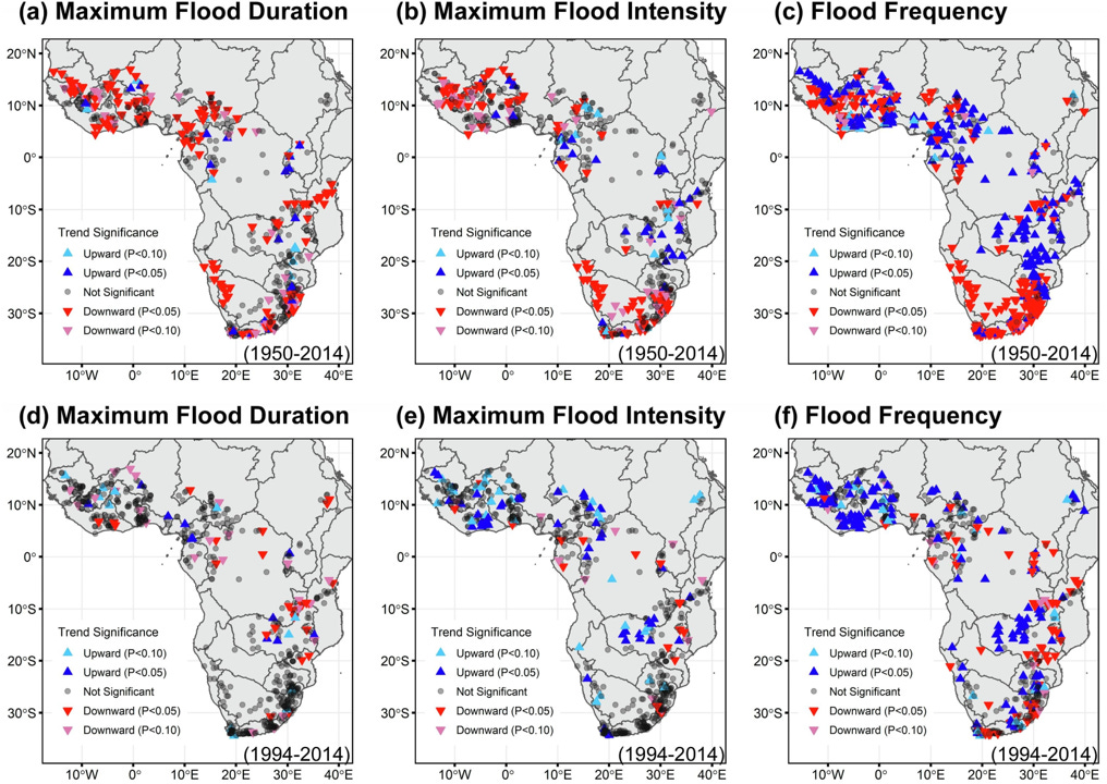 [B]y considering different starting and ending years, we note that trends computed for each of the flood and drought characteristics in the major hydrological basins in SSA are highly variable both in space and time. Such strong spatio-temporal variability in SSA catchments makes it difficult to discuss the presence of significant long-term trends in all flood and drought characteristics between 1950 and 2014. Most SSA catchments show alternating periods of increasing and decreasing trends in flood and drought duration, intensity, and frequency (Fig. 7, Fig. 8, Fig. 9), suggesting that significant decadal to multidecadal variations could be present in all flood and drought characteristics. Overall, such variations show similar directional and temporal patterns (or timing) in either flood or drought characteristics for most of the catchments, but these changes are generally in opposite directions between the floods and droughts. More importantly, however, such variations are aperiodic (i.e., magnitude changes over time), and this can substantially affect trend detection analysis.