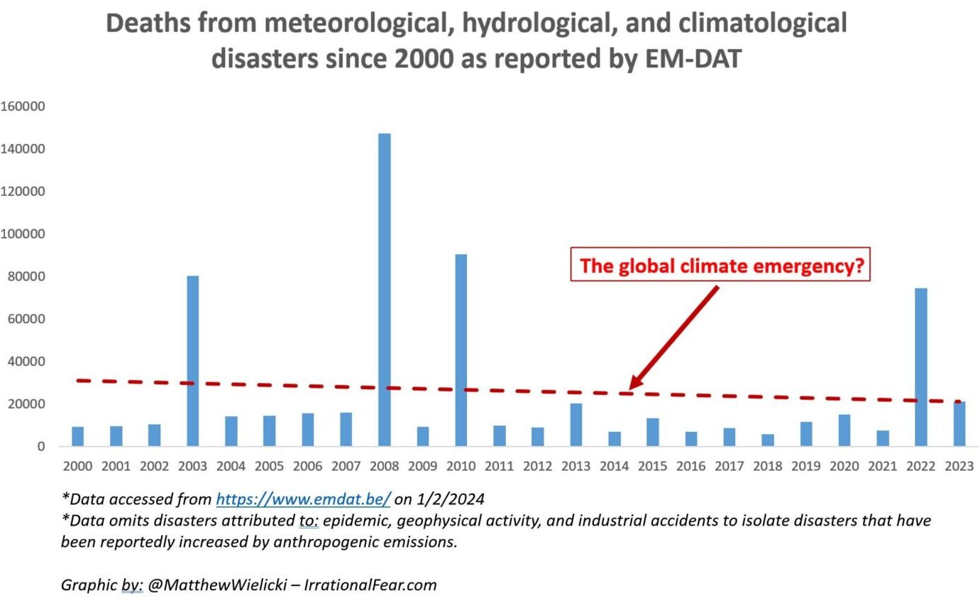 A glance at the actual data on climate-related deaths paints a very different picture than the one often portrayed. According to the Emergency Events Database (EM-DAT), the number of deaths from meteorological, hydrological, and climatological disasters has been declining steadily since 2000 (see figure).
