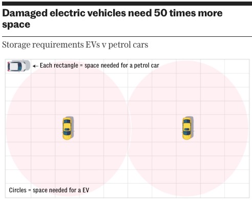 Just two damaged electric cars (EVs) can fit into the same space that would otherwise fit 100 petrol or diesel cars, under current the DVLA and Transport Department guidelines.