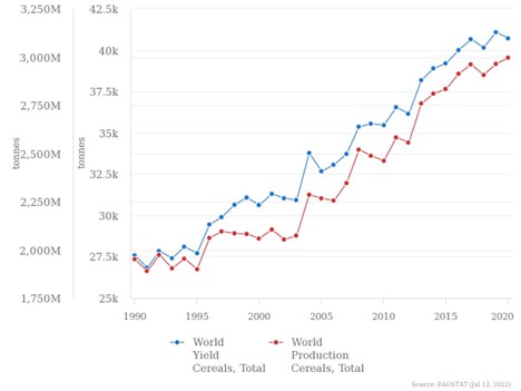 Since 1990, the FAO reports major cereal crops globally have repeatedly set records, as displayed in the graph generated below.