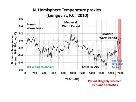 Fig. 6. Two-thousand years of Northern Hemisphere temperature variations from an average of a number of temperature proxies. The period of substantial human-caused warming is generally agreed to be only since 1950 (U.N. IPCC AR5).
