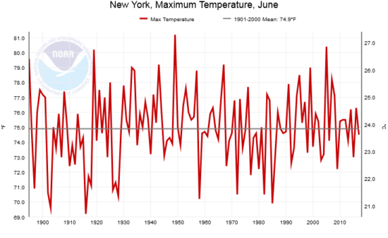 The June 22 memo focus was on the excessive heat in New York state, so let’s begin our journey down Hysteria Lane there. The official NOAA average maximum temperatures for every June since 1895 in New York looks like this: