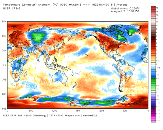 Fig. 2. NOAA CFS model-diagnosed surface temperature departures from normal for May 2018, showing the regional nature of the record U.S. warmth that month (graphic courtesy of WeatherBell.com).