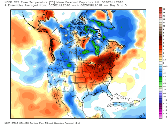 What about this week’s heat wave? Let’s look at NOAA’s GFS forecast model 5-day average temperatures for this week (Monday through Friday, July 2-6, 2018, graphic from WeatherBell.com):