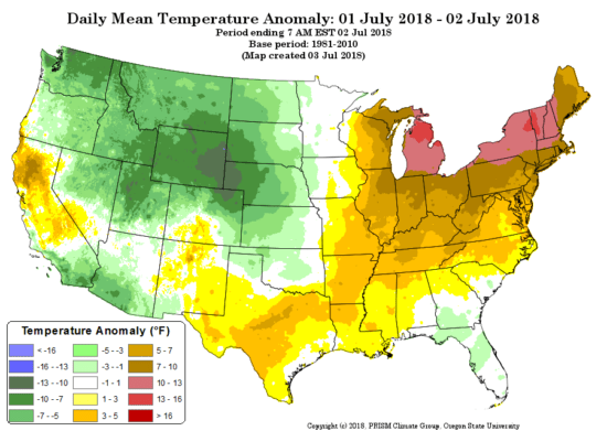 Fig. 4. Oregon State University Prism temperature analysis for July 1-2, 2018, as departures from the 1981-2010 average.