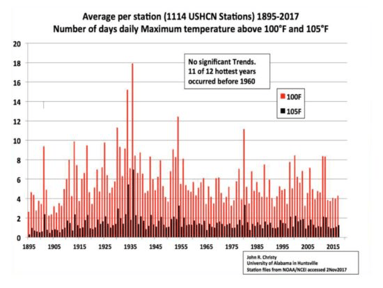 How about extremely high temperatures in the U.S in general? Here are the yearly total number of days above 100 and 105 deg. F, again for the years 1895 through 2017, based upon official NOAA data:
