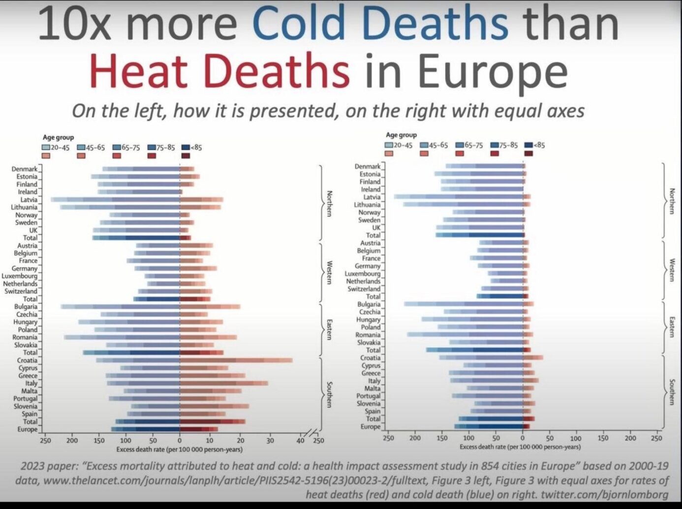 Observe how the prestigious journal The Lancet drastically exaggerated the threat of heat death by making each heat death show up five times larger than each cold death on this bar chart!4