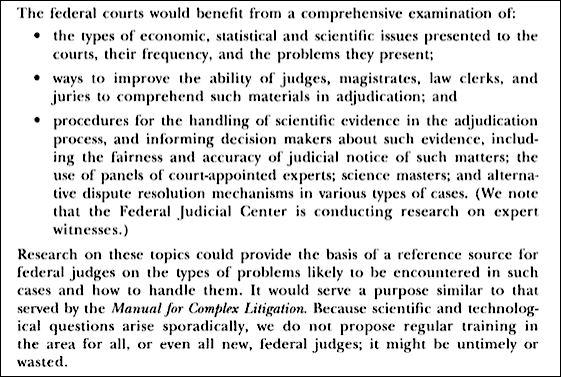 The resulting report, published in 1990, recommended a need for improved guidance for judges on how to handle complex issues of science and technology, and suggested the creation of a reference manual (see the excerpt in the screenshot below).