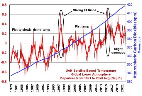 The ad featured a CO2 Coalition graph that matched satellite temperature data from 1978-2021 with the record of rising atmospheric carbon dioxide, which is compiled at the Mauna Loa (Hawaii) Observatory of NOAA’s Global Monitoring Laboratory.