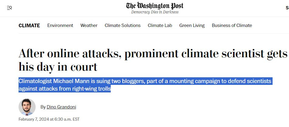 This venue dictated that this case was going to arrive at only one conclusion. No liberal, lefty or DC judge will “defend to the death your right to say it”. The plaintiff lied to the court yet somehow the judge just let that one slide. There is no discourse or debate regarding shoddy science – evidence presented that hockey stick graphs can be assembled in many ways (even up side down using Mann’s ‘data’) but only Mann’s interpretation is dubiously correct. Harvard cancer biologist is going to have some 20+ papers retracted for falsifying results – yet merely a peep about it and how science has been perverted. We have now the unquestioning believers in one camp shouting down the other camp of the curious (who are not nonbelievers just skeptical with the lack of evidence provided). Boy, I sure wish it was 1.5 degrees cooler today to prevent the planet from melting