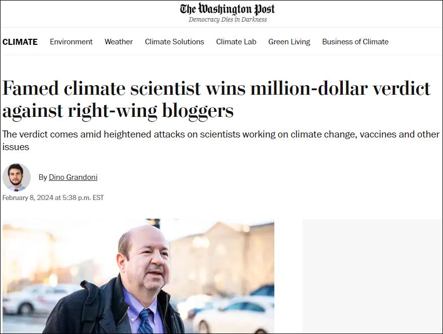 Yesterday, a jury in Washington, DC awarded renowned climate scientist Michael E. Mann more than $1,000,000 in damages in a defamation lawsuit he brought against two bloggers.1