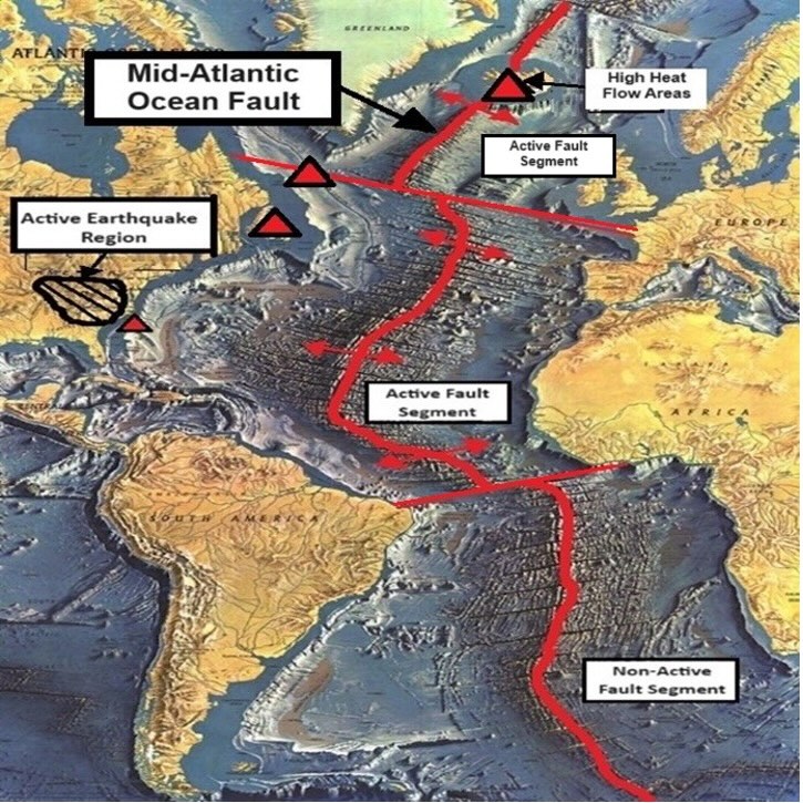 Here we show that the only plausible explanation for both events is that geological forces have acted to suddenly and significantly push apart two segments of the N. Atlantic Ocean’s seafloor rock layers (Figure 1).