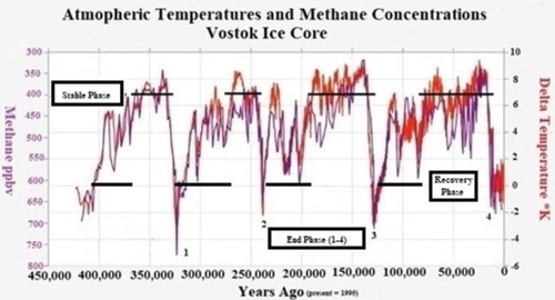 The concentration of atmospheric methane, concentration of atmospheric CO2, and value of atmospheric temperature during the Recovery Phase have been calculated utilizing various proxy procedures from the Antarctic Vostok Ice Core. The resulting data is illustrated in Figures 2 and 3.