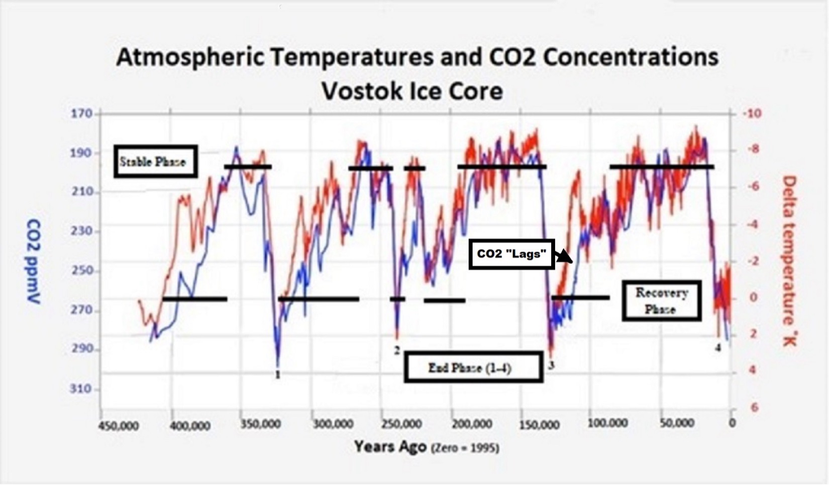 The concentration of atmospheric methane, concentration of atmospheric CO2, and value of atmospheric temperature during the Recovery Phase have been calculated utilizing various proxy procedures from the Antarctic Vostok Ice Core. The resulting data is illustrated in Figures 2 and 3.