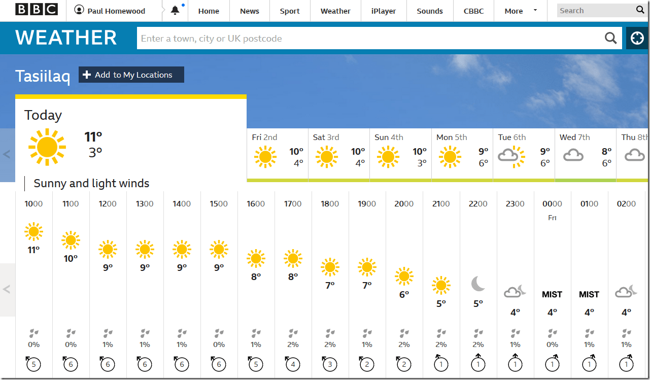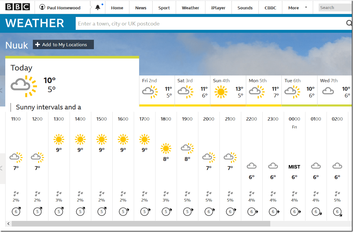 Meanwhile, back in the real world, temperatures at Nuuk in the west, and Tasiilaq in the east are peaking at 7C and 11C respectively. The warmest spot is further north in Ilulissat, where it will reach 16C today.