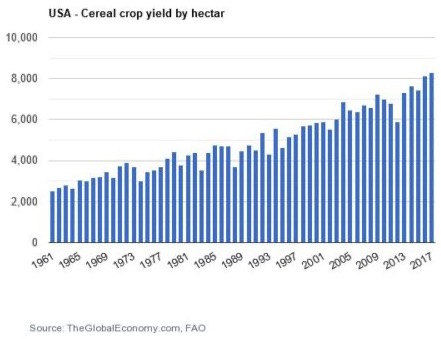 The chart below, produced from United Nations Food and Agricultural Organization data, shows Guatemalan production of the big three cereal crops – corn, wheat, and rice – is experiencing long-term growth. 2017, the most recent year for which data is available, produced the fourth largest Guatemalan cereal crop on record.