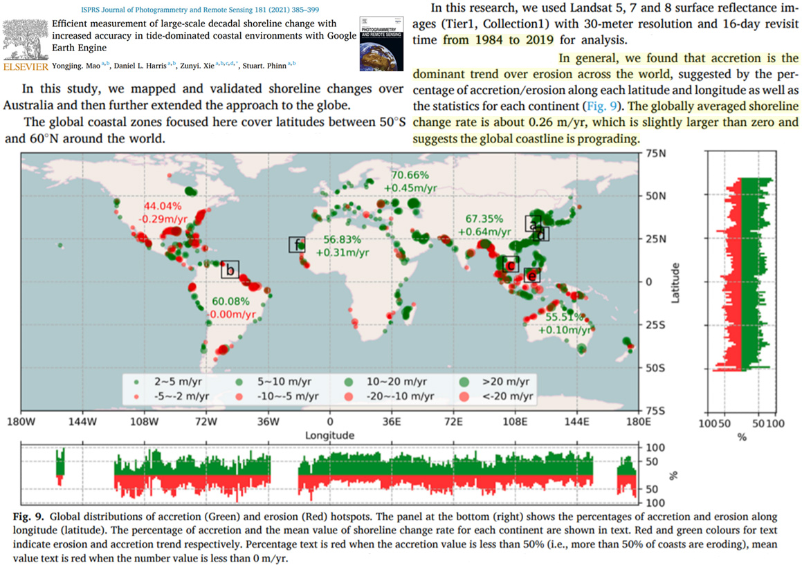 According to Mao and colleagues, Australia’s coasts have been growing at a rate of +0.10 m/year since 1984. Asia’s coasts have been expanding +0.64 m/year. Europe’s coasts are accreting +0.45 m/year. And the African continent has been observed expanding at a +0.31 m/year clip.