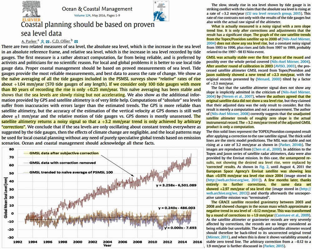 So instead of reporting on what the actual satellite observations showed, arbitrary, subjective assumptions were employed to “correct” the data to show sea levels have been rising at rates of 3.2 mm/year instead.