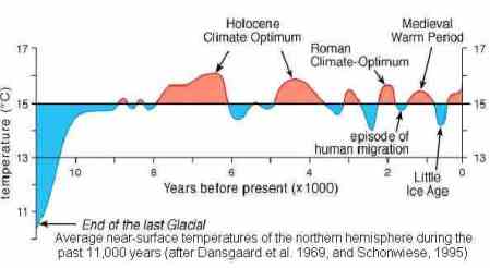 Here, too, we see a temperature fluctuation (recorded by lake-bed sediments and ice cores). The fluctuations are due mainly to several different solar cycles, which when combined produce a 1,500-year cycle of warming and cooling.