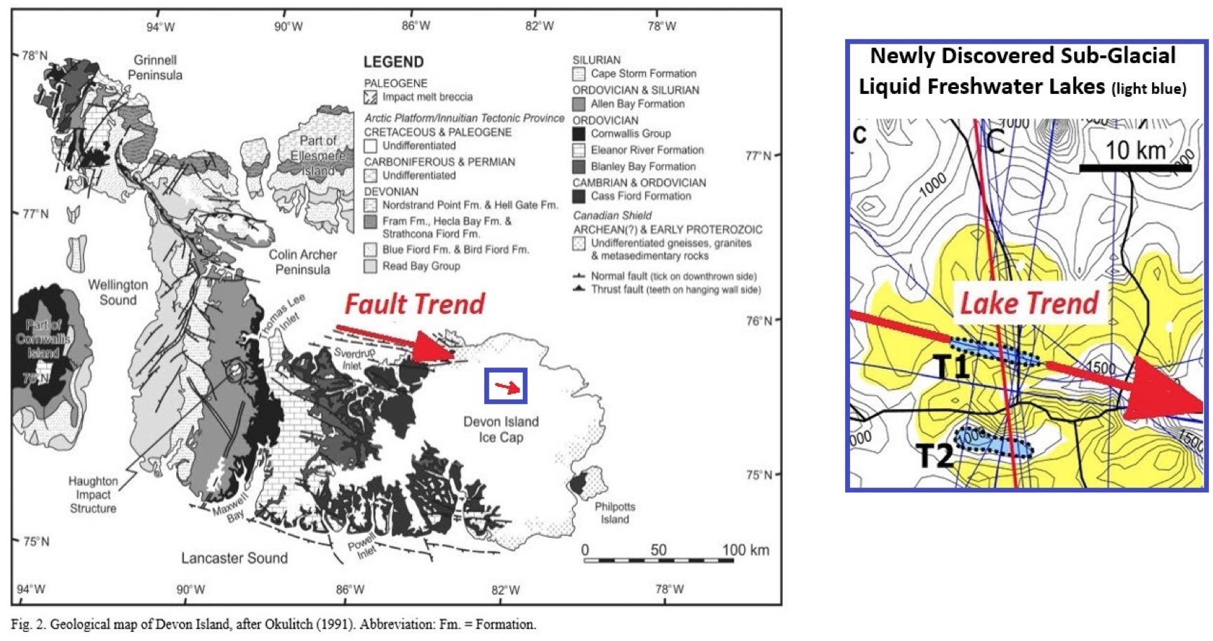 The long, linear shape and orientation of the subglacial lakes perfectly match the surface trend of faults that abut the Devon Ice Sheet (Figure 3).