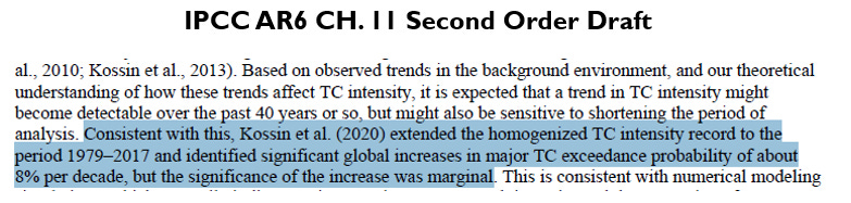 Below is the relevant discussion of tropical cyclone intensities in the First Order Draft (FOD) of IPCC AR6 Chapter 11 (hereafter, just Ch.11, and in the images below I have added the highlighting).