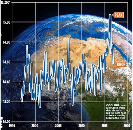 New official data issued by the Met Office confirms that world average temperatures have plummeted since the middle of the year at a faster and steeper rate than at any time in the recent past. The huge fall follows a report by this newspaper that temperatures had cooled after a record spike. Our story showed that these record high temperatures were triggered by naturally occurring but freak conditions caused by El Nino ‚Äì and not, as had been previously suggested, by the cumulative effects of man-made global warming. To the end of October, the last month for which figures have been released, Hadcrut4 had fallen about 0.5C from its peak in the spring. –David Rose, Mail on Sunday, 11 December 2016