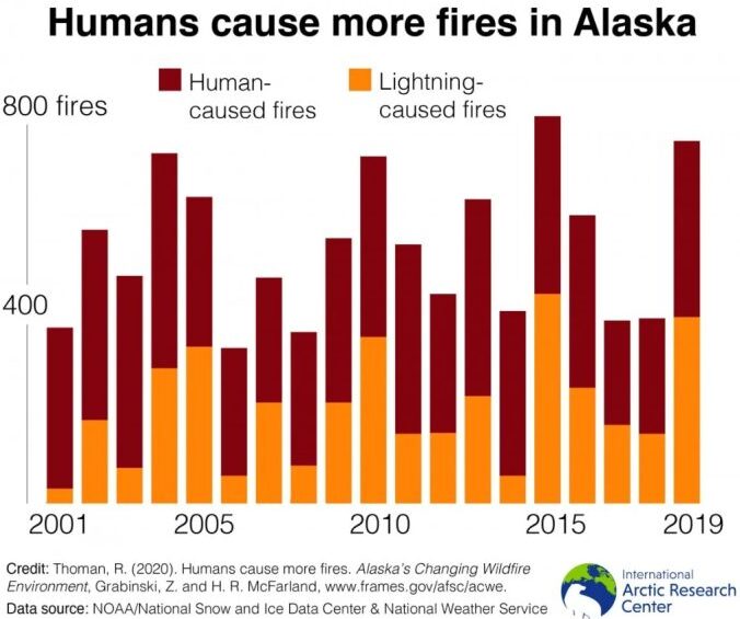 First, as the wildfire data seen in Figure 1 below from the International Arctic Research Center (IARC) clearly shows, the majority of Alaskan fires are caused by humans and lightning – neither of which are climate-driven metrics.