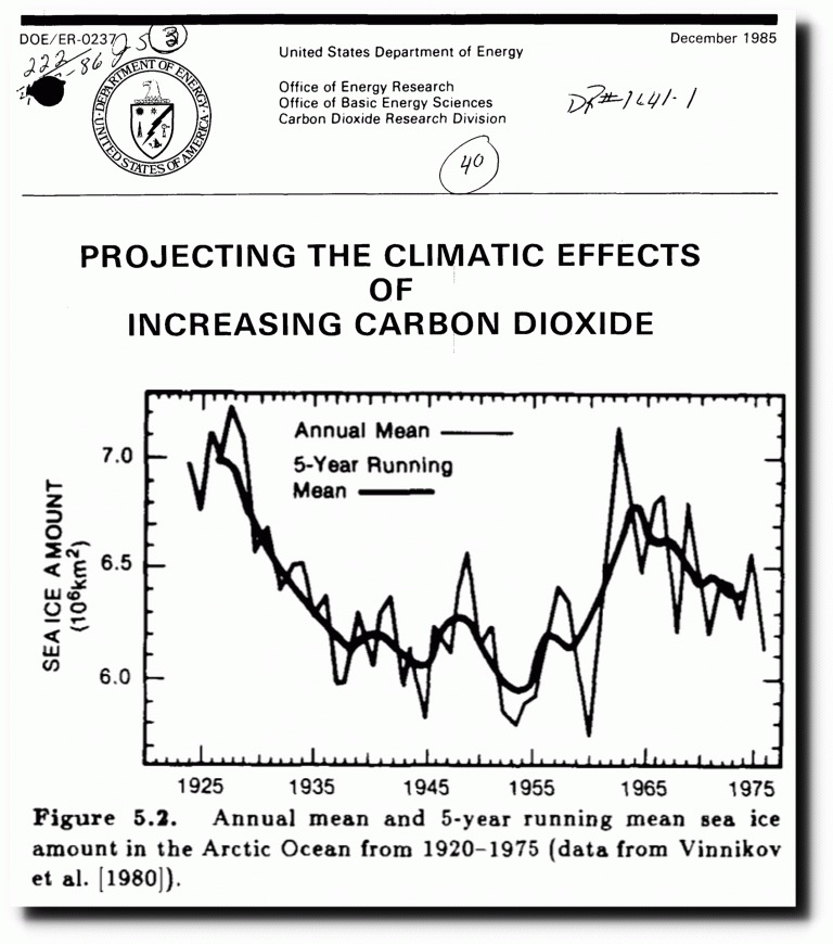 In 1985 the DOE showed a 15% decline in Arctic sea ice area from 1925 to 1955, which is missing in the NOAA graph.