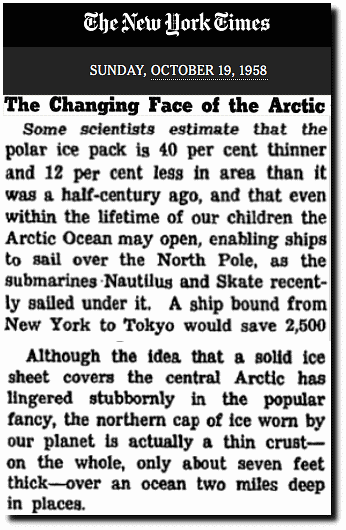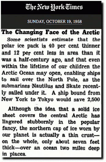 In 1958, the ice was disappearing rapidly, and the New York Times predicted the Arctic would be ice-free soon.