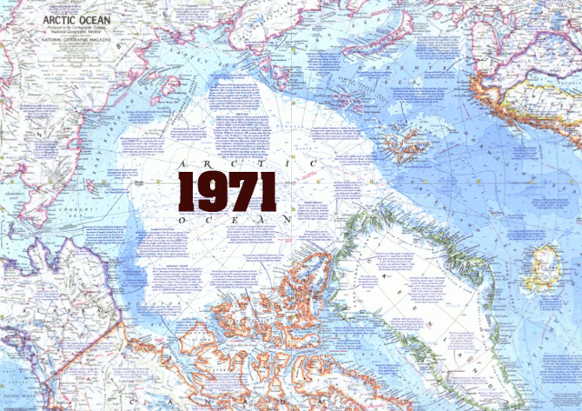 In 1971, National Geographic published a very detailed map of Arctic sea ice. Extent this year is not terribly different from 1971.