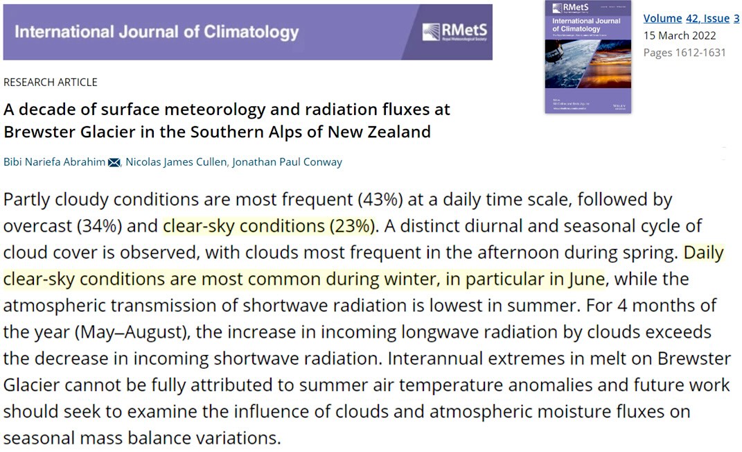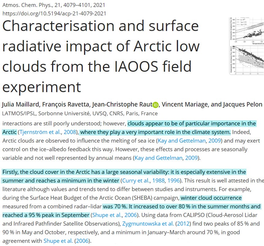Also, it is well known that warmer summers are cloudier than colder winters (see Malliard et al., 2021 and Abrahim et al., 2022 below, for example). Cloudier summers can be 10 to 15°C warmer than clearer-sky winters across the middle and high latitudes.