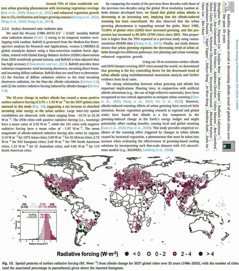 Per the authors, this greening trend is the key factor lowering the albedo-reflecting incoming solar radiation in urban areas, amounting to a +2.76 W/m² increase in solar radiation reaching the surface from 1986-2020.