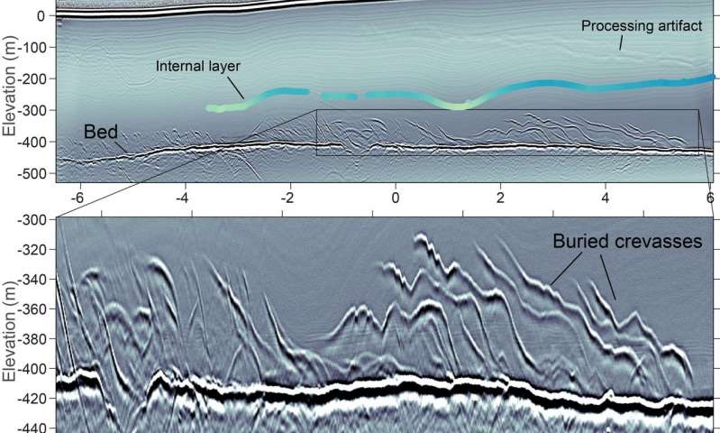 They discovered many buried features within the ice sheet, interpreted as relic crevasses that had later filled with marine ice.