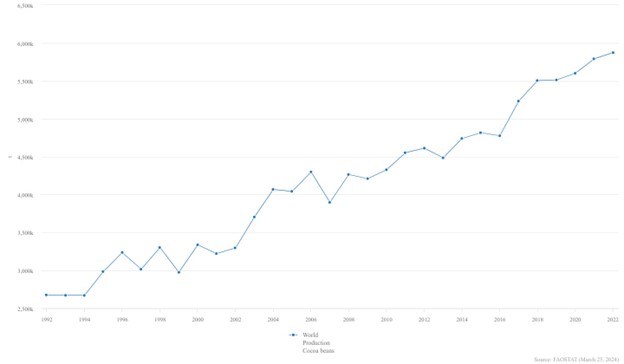 Globally the story is much the same. Global cocoa bean production from 1992 to 2022 grew by nearly 120 percent, setting records for production 19 times, with each of the last six years setting new records for production. (see the figure, below)