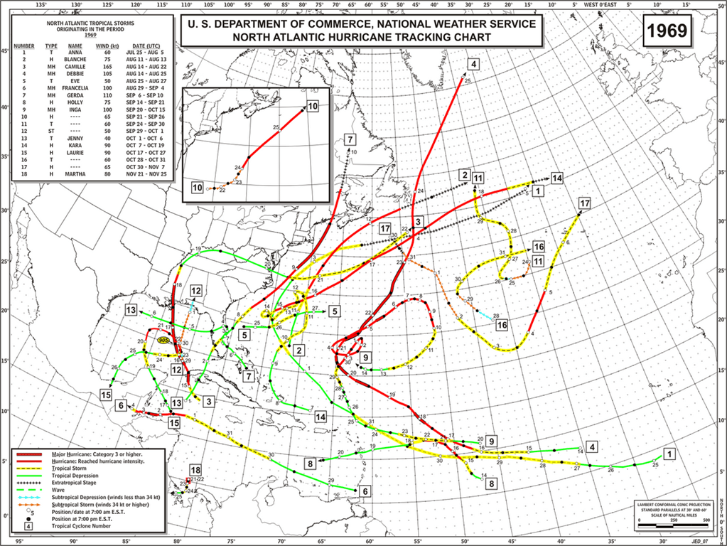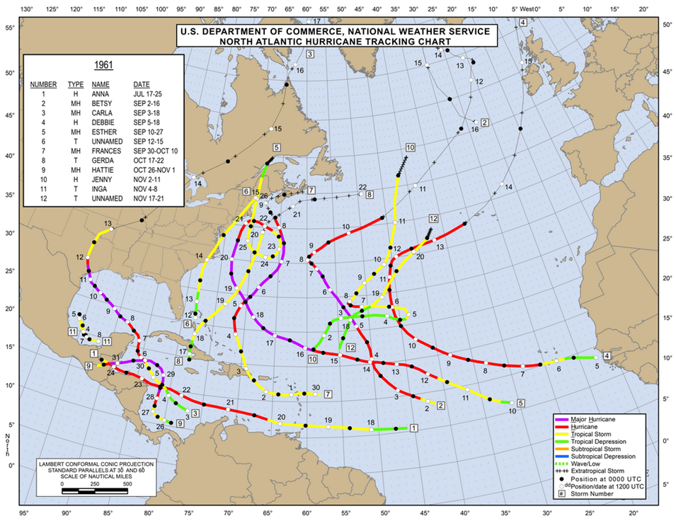 When we compare this year’s hurricane tracks with some other busy years, such as 1961 and 1969, the absence of mid-ocean storms in the latter years is immediately clear: