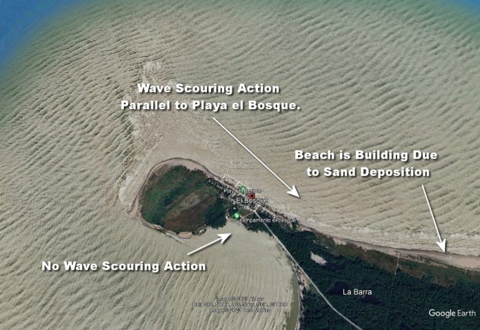 El Bosque, like other peninsular sandbars was created in the first place by continuously changing land erosion and deposition over time, driven by waves.