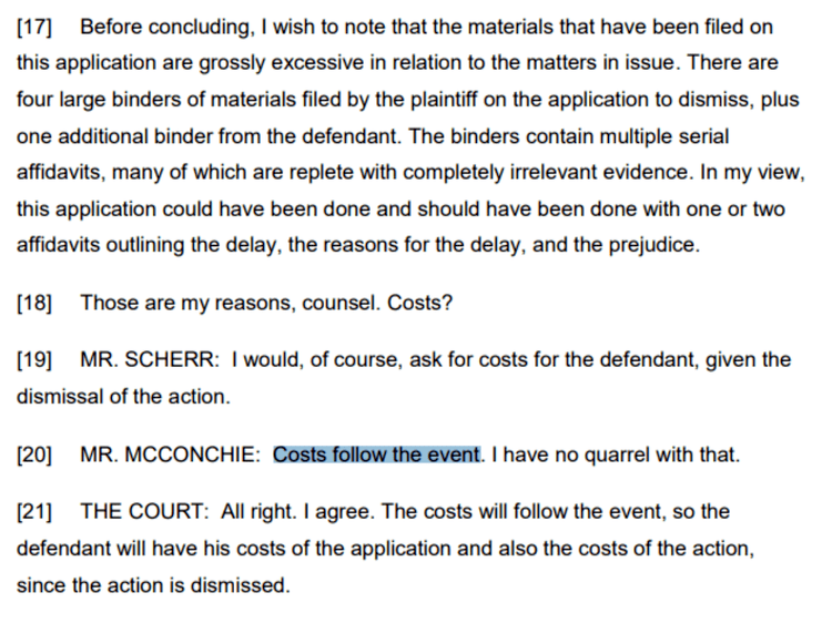 As you can see, Mann’s lawyer (McConchie) did not even oppose the application for costs, since that is the norm in Canadian litigation. But, in an event that will probably surprise no one, it turns out that in the intervening three years the execrable Mann has never paid anything to Ball.